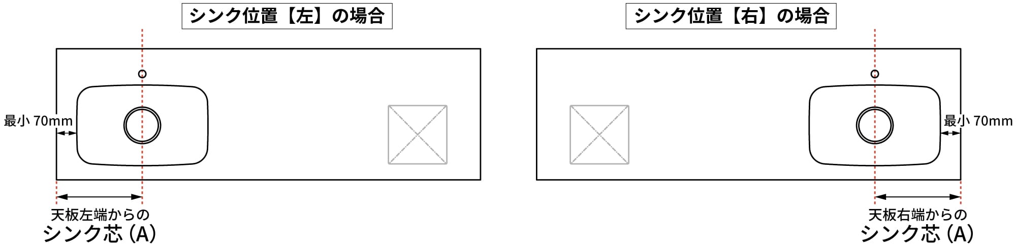 ・シンク位置「左」の場合:天板の「左端」からシンク芯(中央)までの寸法