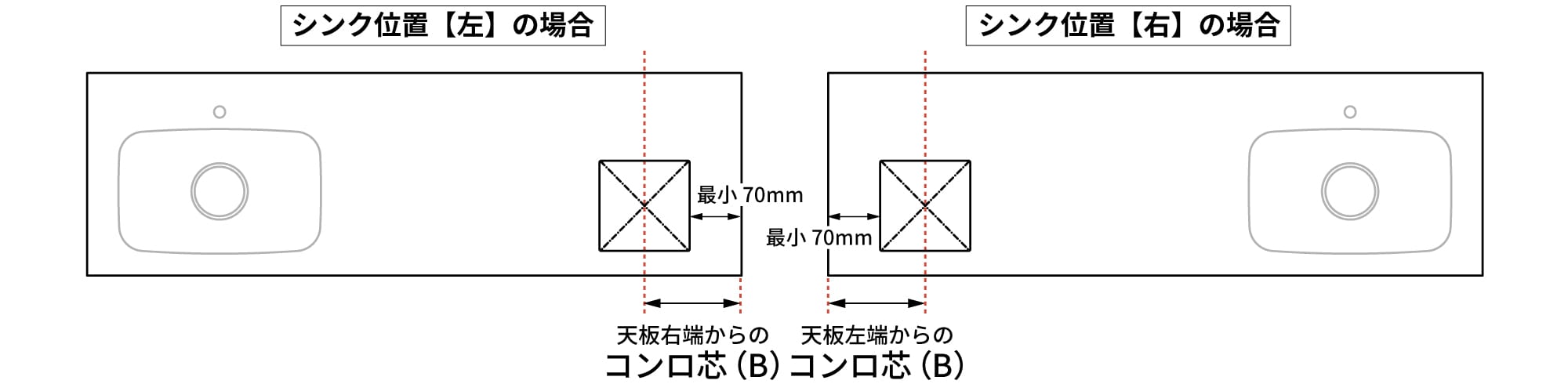 ・シンク位置「右」の場合:天板の「右端」からシンク芯(中央)までの寸法