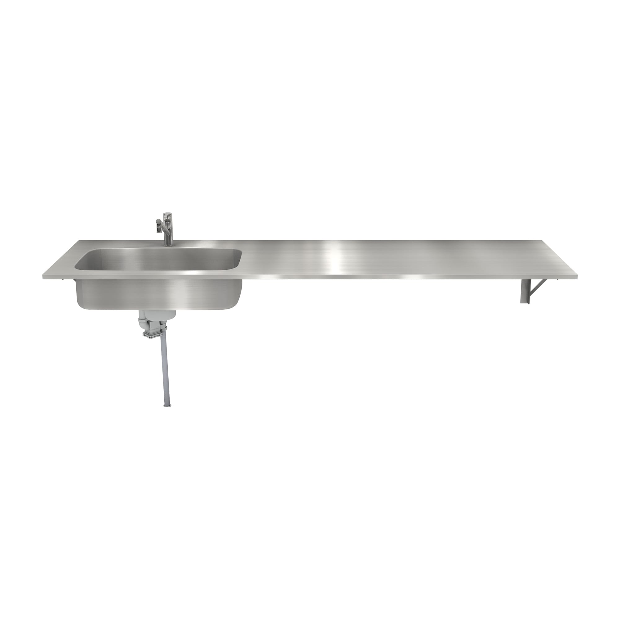継ぎ目なくシンクが付いた、ステンレスのキッチン天板です。天板の幅と奥行きをサイズオーダーできるようにしているので、設置したい場所にぴったりと収まります。