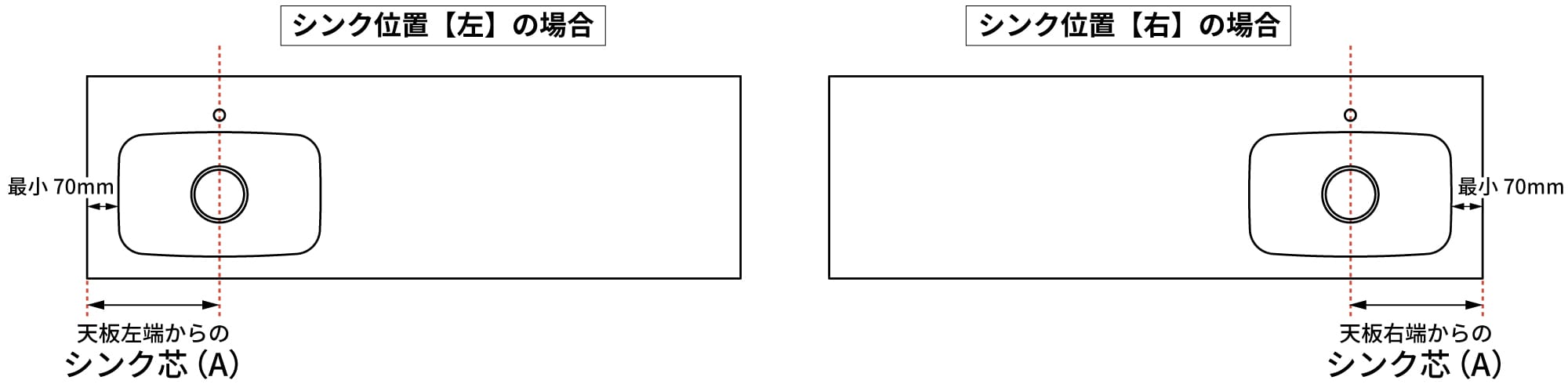 ・シンク位置「左」の場合:天板の「左端」からシンク芯(中央)までの寸法