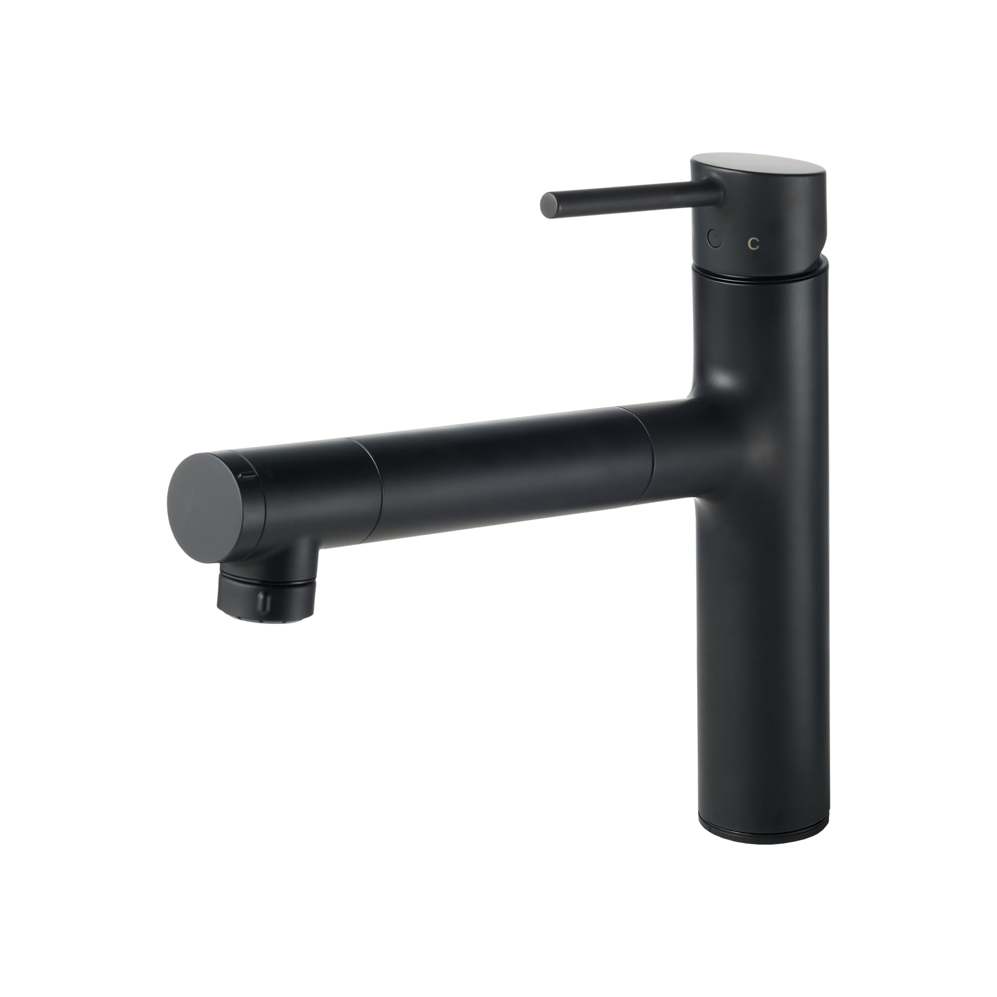 浄水と湯水をレバーで切り替えができる、1本で多機能な浄水器付きのキッチン水栓です。専用の浄水カートリッジが付属し、スパウト部分に内蔵させて使用します。