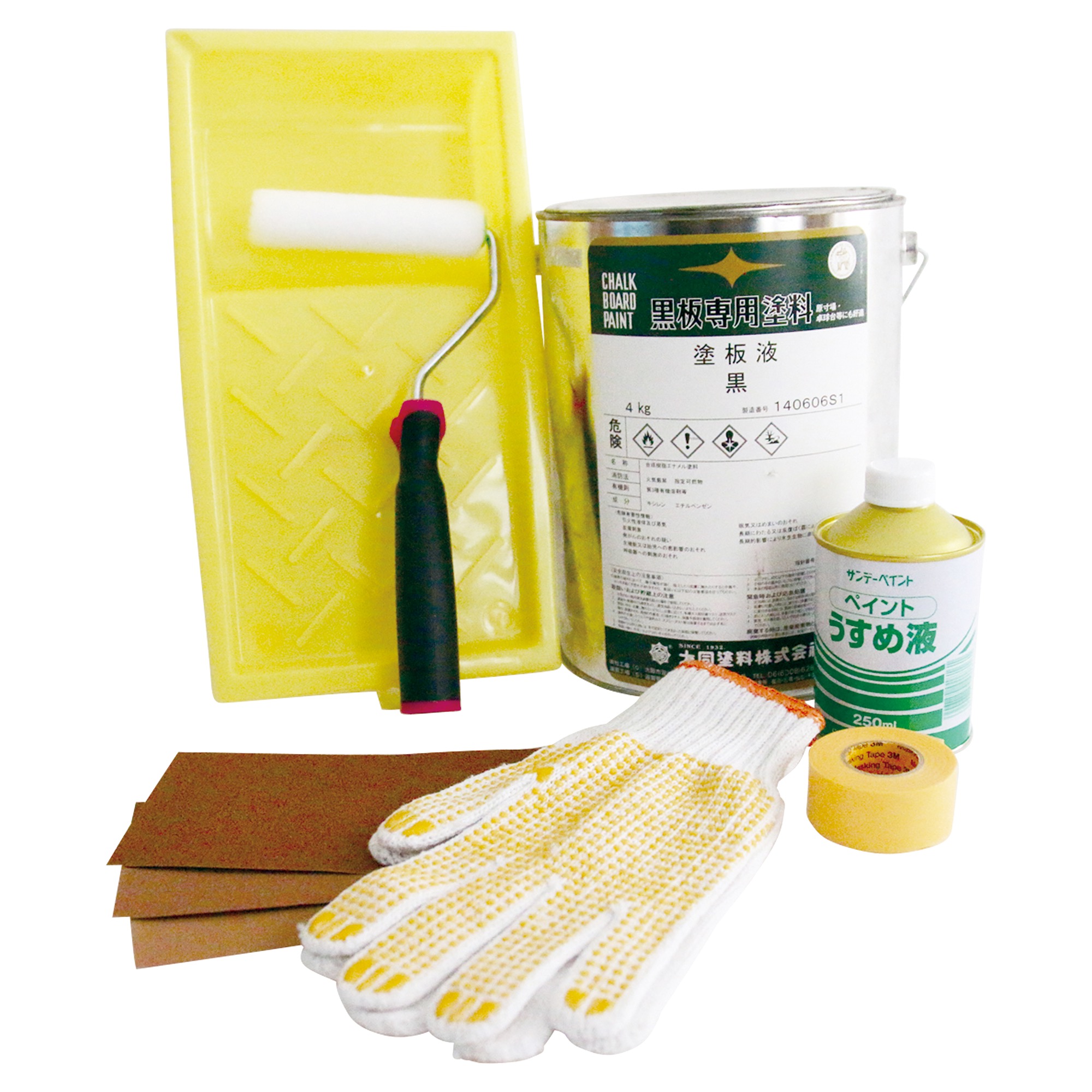 ・ローラー皿(4インチ用)・ローラーハンドル(9インチ)・ウレタン短毛 スモールローラー(4インチ)・軍手・マスキングテープ(24mm幅)・ペイントうすめ液(250ml)・EFサンドペーパー 黒板ペイント用 6枚セット