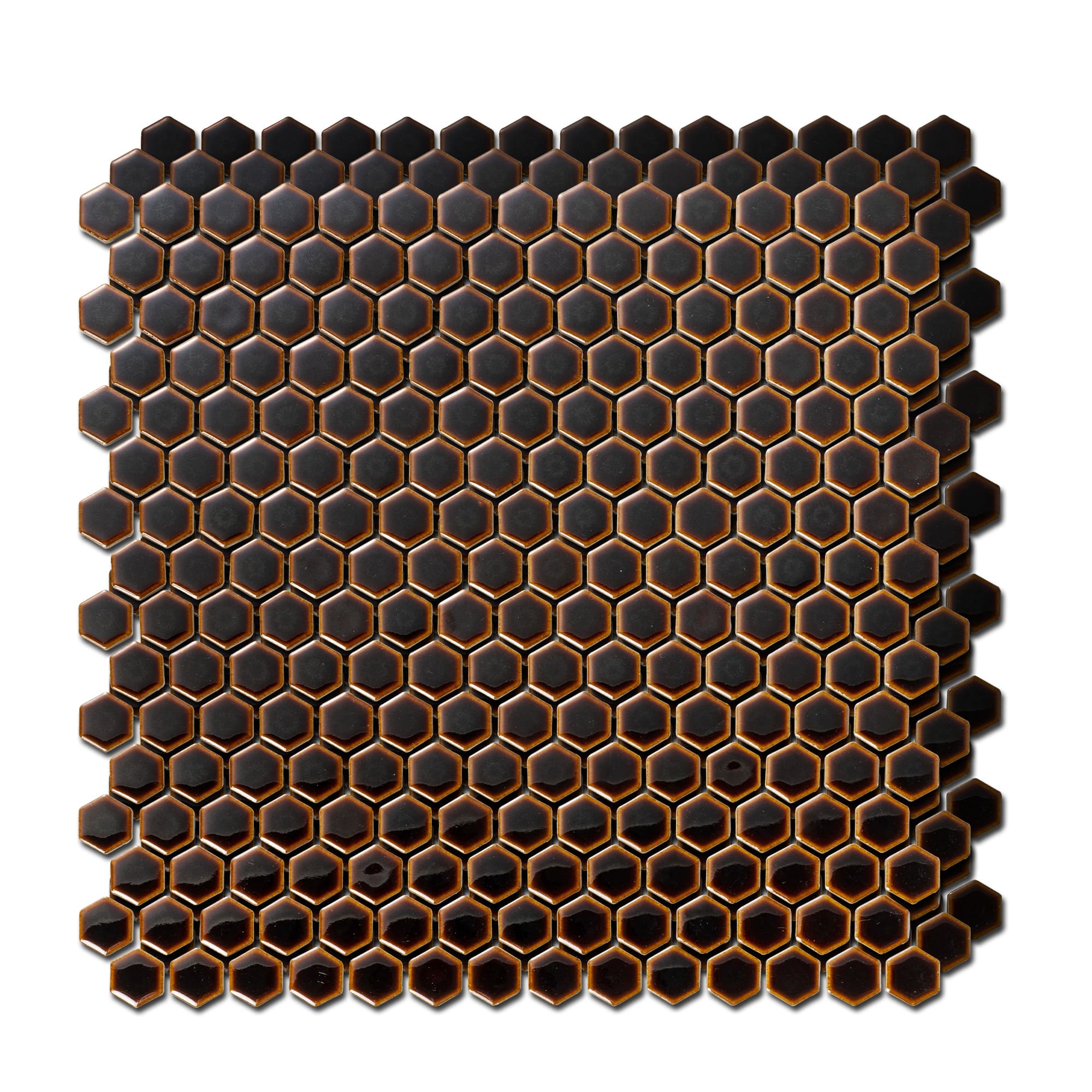 窯変の味わいを活かした六角形のモザイクタイルです。とろっと吸い込まれるような黒蜜色のツヤが魅力的。