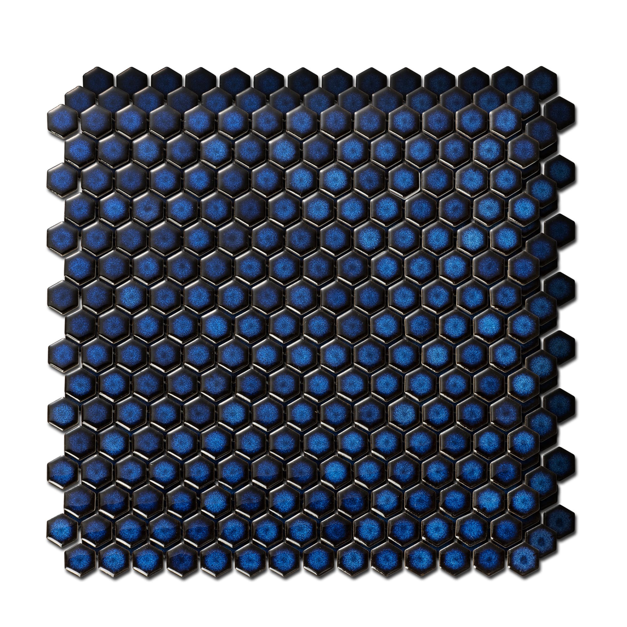 窯変の味わいを活かした六角形のモザイクタイルです。釉薬のムラが奥行きを感じさせる、コバルトブルーのツヤありタイル。