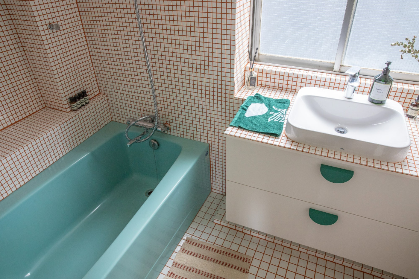 あと、ピーコックグリーンのバスタブも気に入っていたアイテム。この部屋のバスルームを見て思い出したのは、フランスの祖父母の家のバスルーム。イエローのバスタブに、ブルーのタイル、ブラックのタイルも使われていました。当時の流行りだったんでしょうね、そのポップな雰囲気が好きだったんです。この浴槽を活かして、祖父母の家のバスルームの雰囲気を取り入れたいと思ったんです。