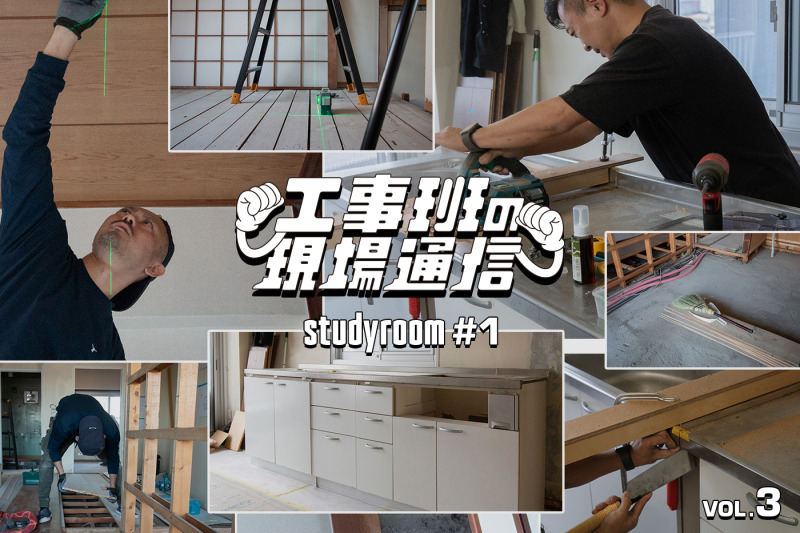 ツールボックス工事班によるリノベーションの実験『studyroom #1』。築50年越えのマンションで「ReMake」をテーマに掲げ、極力壊さず、既存の内装に手を加えながら空間全体をつくり変えるアプローチにトライしています。前回の解体では、フローリングと和室の天井、キッチン本体は、壊さずに既存のまま残しました。これらをどうリメイクしていくかを考えて、工事班から出てきたアイデアは「切ってみる」でした。