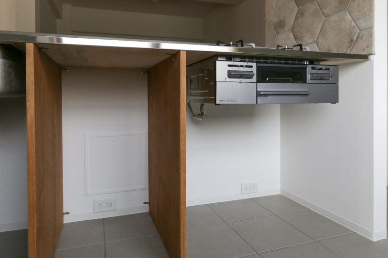 食洗機の扉部分の面材と巾木は、キッチン本体とのバランスを考えて別途手配する必要があります。扉付きのキッチンのオプションとして食洗機が選べる場合は、同じ面材での納品が可能です。また、キッチン下のキャビネットの一つとして納められることが多い食洗機ですが、露出で設置する場合は、食洗機本体の側面は仕上がっていない前提で、そのまま露出するか、隠しパネルを設けるのかを検討ください。