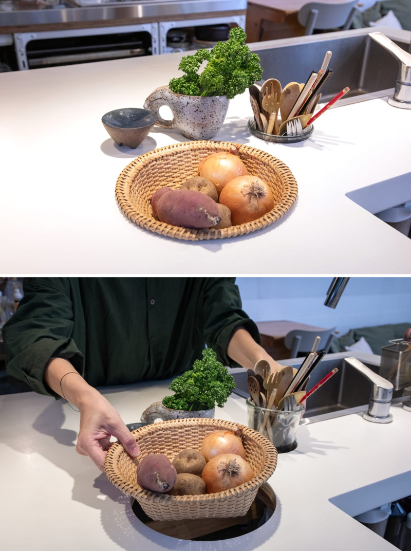 テーブルに埋め込まれたカトラリー入れとカゴ。天板上をすっきりさせるため、天板に穴をあけ、カトラリーを入れるグラスと、小さなカゴを落とし込み。カゴの中身は、フルーツ、お菓子、野菜などが入るものが入れ替わります。掃除のたびに持ち上げてテーブルを拭く手間も、うっかり倒したりもなくお気に入りなのだとか。