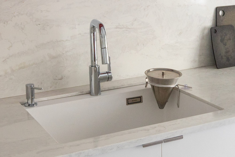 洗剤の置き場にお困りの方には、キッチンシンクや天板に設置する、埋め込み型のソープディスペンサーがおすすめ。シンプルなフォルムでキッチン空間がすっきりします。