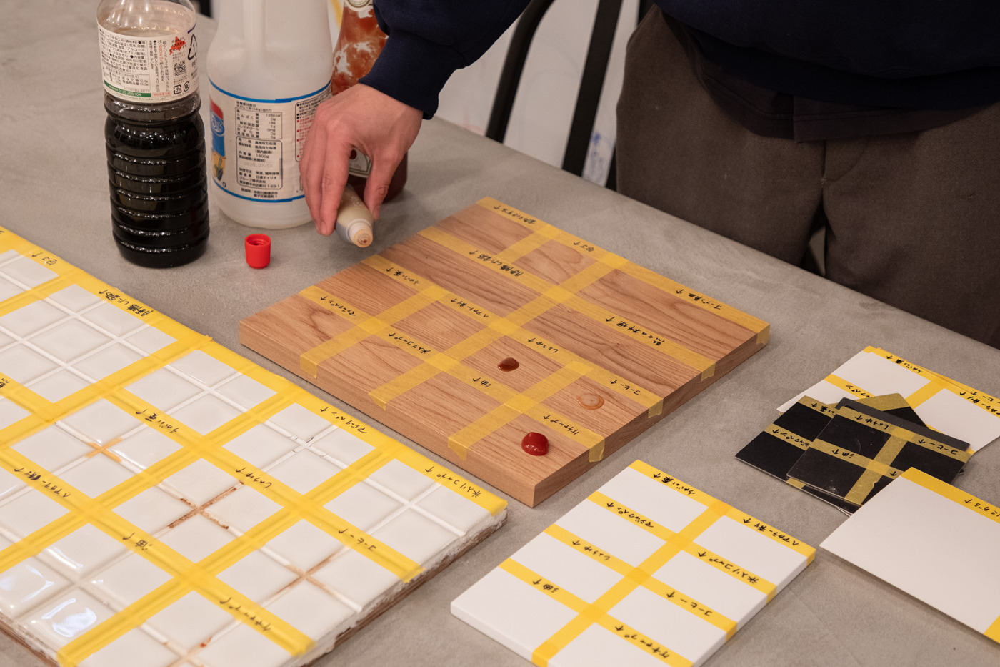 また、キッチン天板として使うことを前提にした商品ではありませんが、汚れや傷への耐性がどのくらいあるのか気になったので、<番外編>としてtoolboxで販売している『モルタル天板』と『水彩タイル』を使ったタイル天板でも検証してみました。