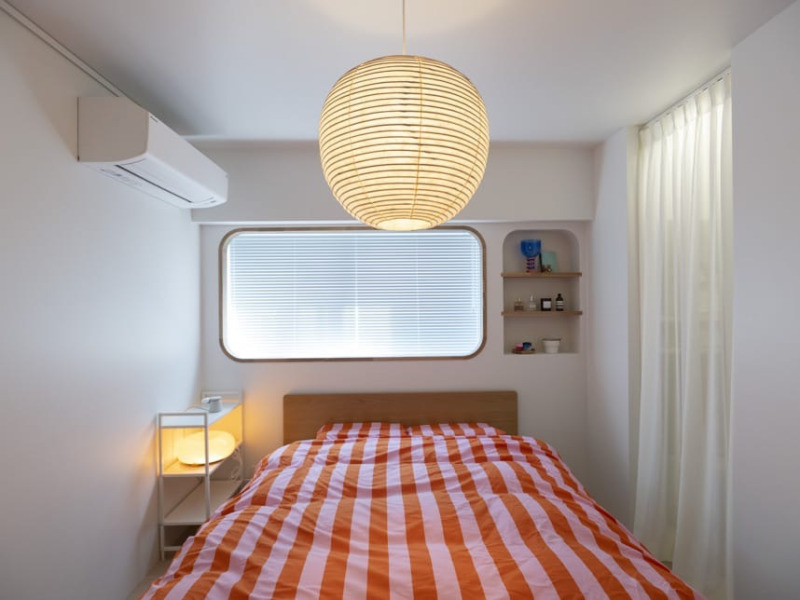 木製の窓枠はアールの形状で優しい印象。照明の柔らかい雰囲気と合わさり、リラックスできる寝室に。