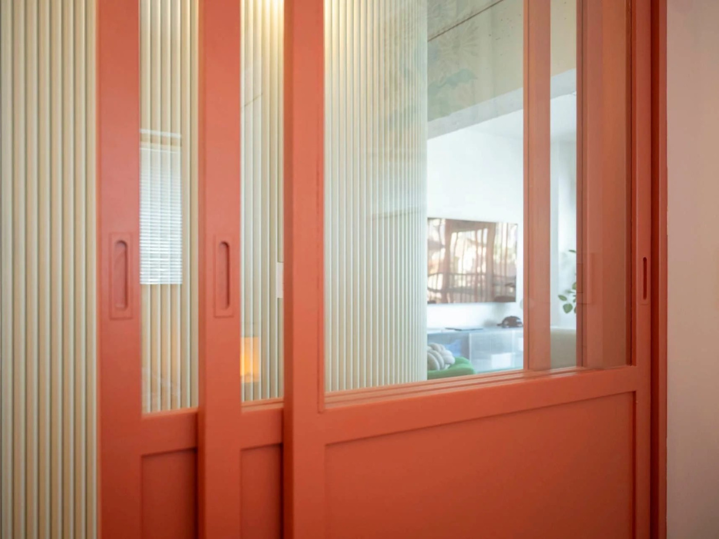 寝室の造作建具はテラコッタカラーで塗装。大きなガラスをはめ込むことで、空間を緩やかに繋げて、開放感をもたらしています。