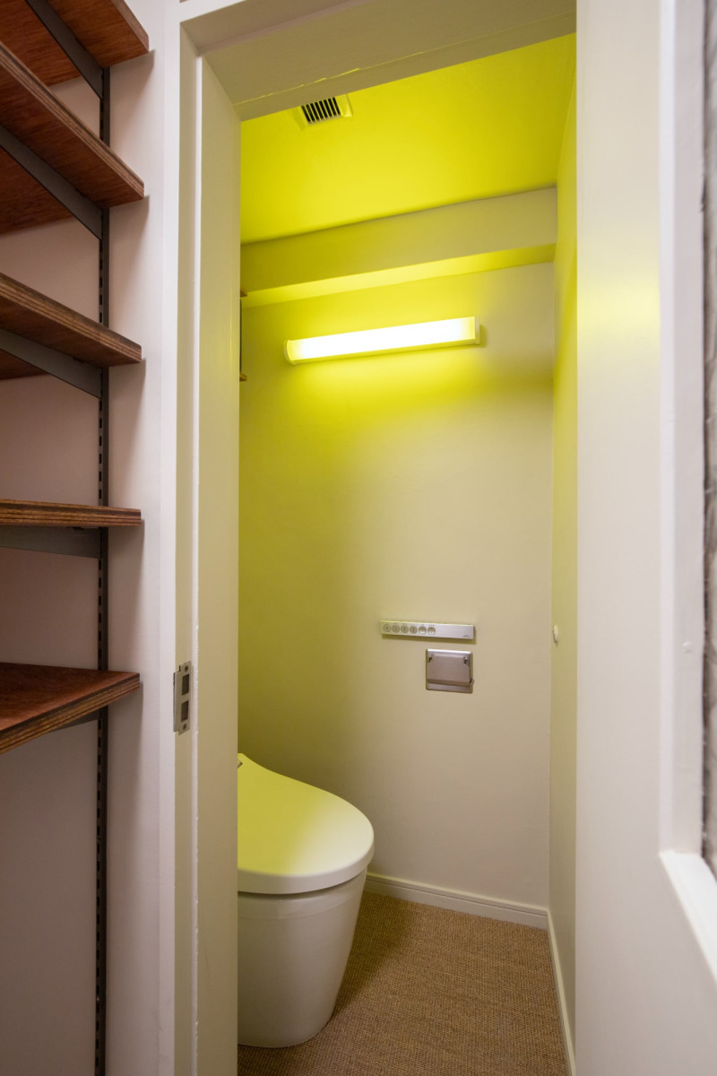 便器とリモコンは既存を利用、壁に付いていた手洗い器や手摺を撤去し、壁と床を仕上げ直したトイレ。イエローの光を放つ照明は、既存の照明器具の中にカラー蛍光灯を入れたもの。