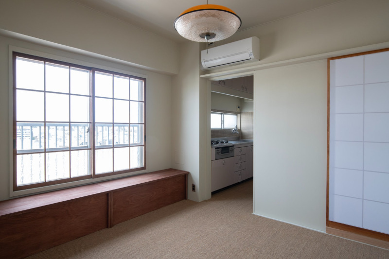 レトロな木枠ガラス窓が内窓として付いていた窓の前には、収納兼ベンチを造作して、“過ごせる窓辺”にリメイク。