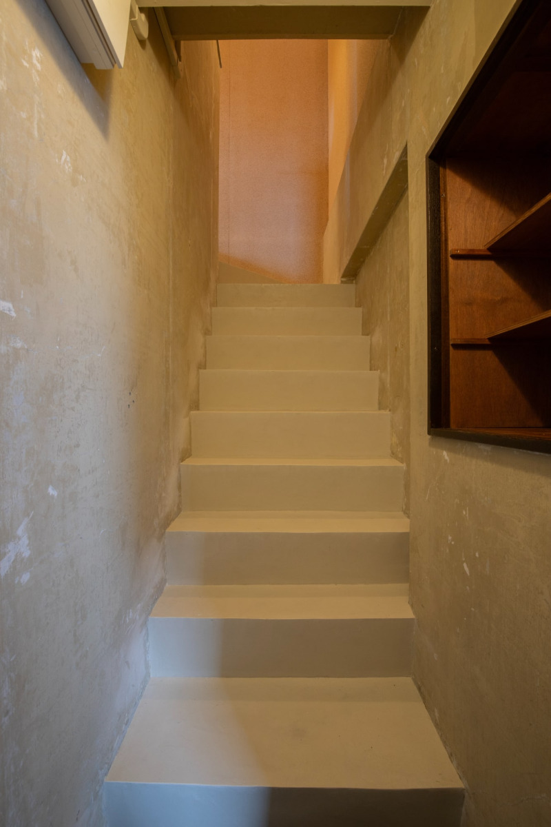 メゾネット住戸下階の玄関から続く階段。元々のクッションフロアを剥がして下地調整材を塗り、クロスを剥がしたモルタル壁と雰囲気を揃えています。