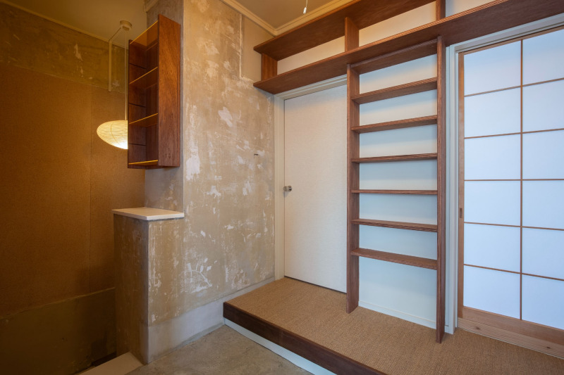 施主の作品を飾るギャラリーとしても使うホールには、各所に棚を造作。独特な表情をした壁は、既存クロスの下にあった塗装面をあえて少し残しながら剥がしたもの。