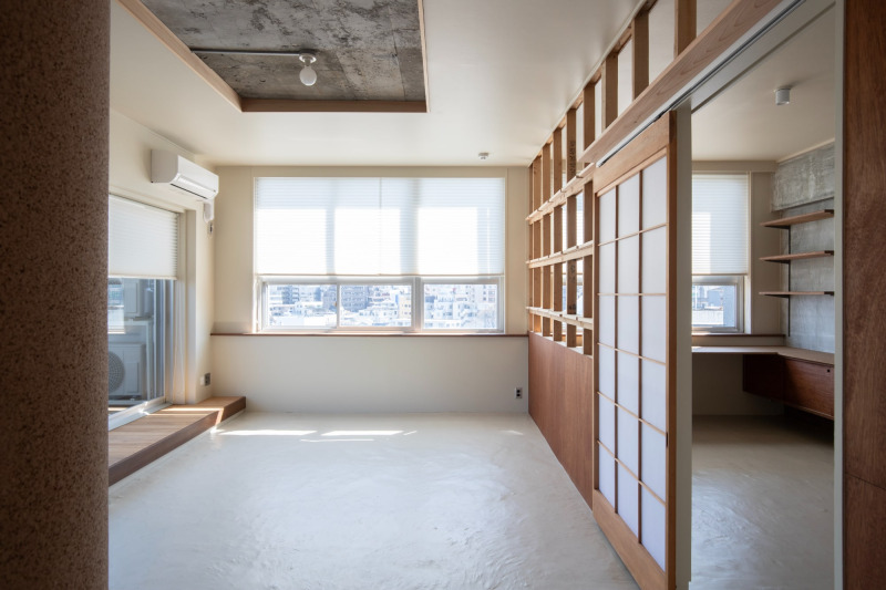 既存の床仕上げを撤去し、下地調整材を塗って仕上げた土間空間。天井は一部を折り上げ天井にして、頭上の抜け感を創出。
