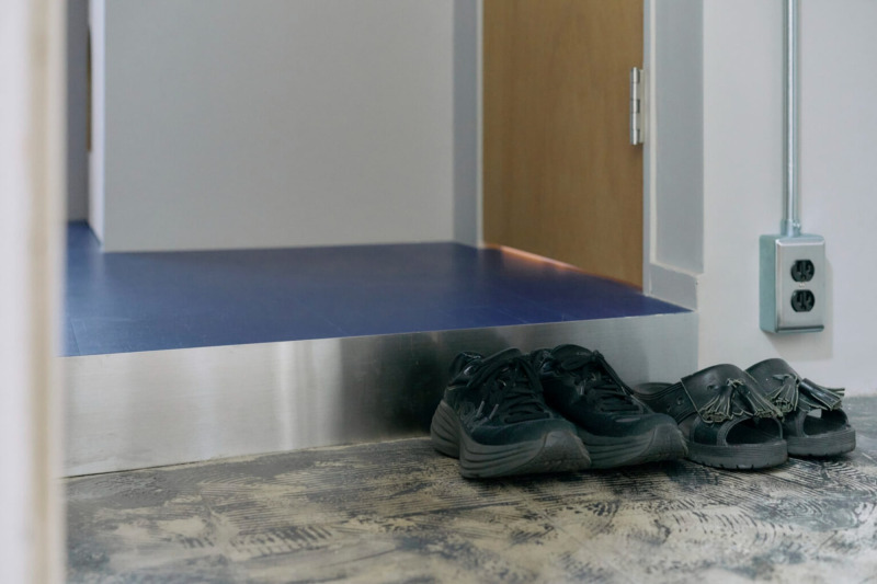 既存の床仕上げを剥がした跡をそのまま生かした、玄関のたたき。上がり框のステンレスと、ブルーの塩ビタイル、ラフなたたきというメリハリのある素材の切り替えに、センスを感じます。