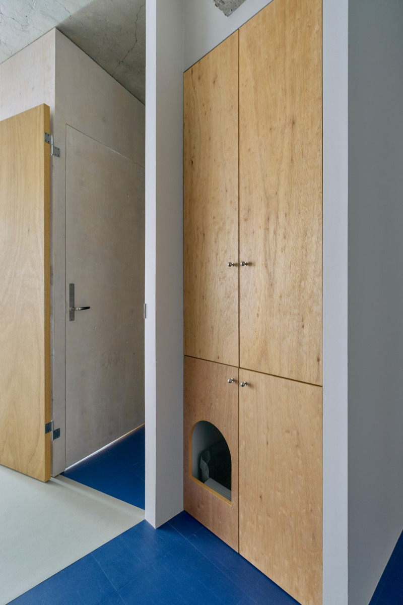 床の鮮やかなブルーとグレーの切り替え、白っぽいラーチ合板壁とナチュラルなラワン合板の扉。グラフィカルな色と素材の組み合わせが印象的。