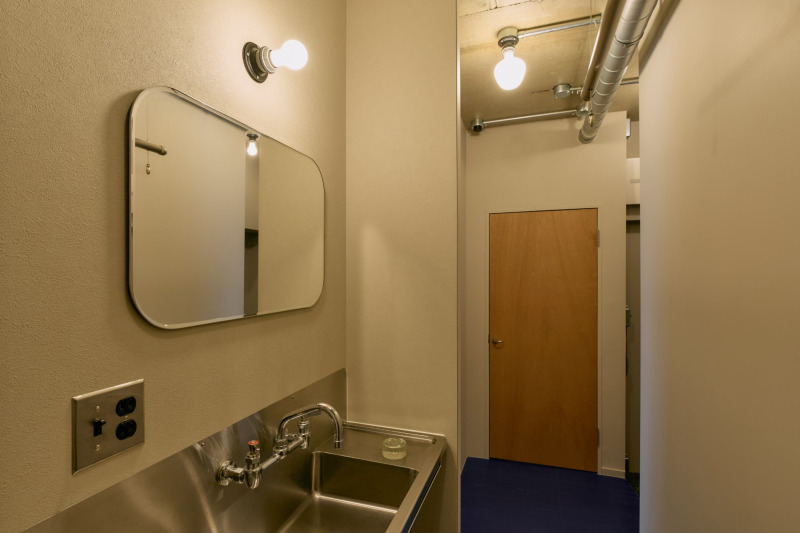 ジャブジャブ洗い物ができる、バックガード付きのシンクを備えたランドリースペース。大きな鏡を添えて、洗面機能も持たせています。