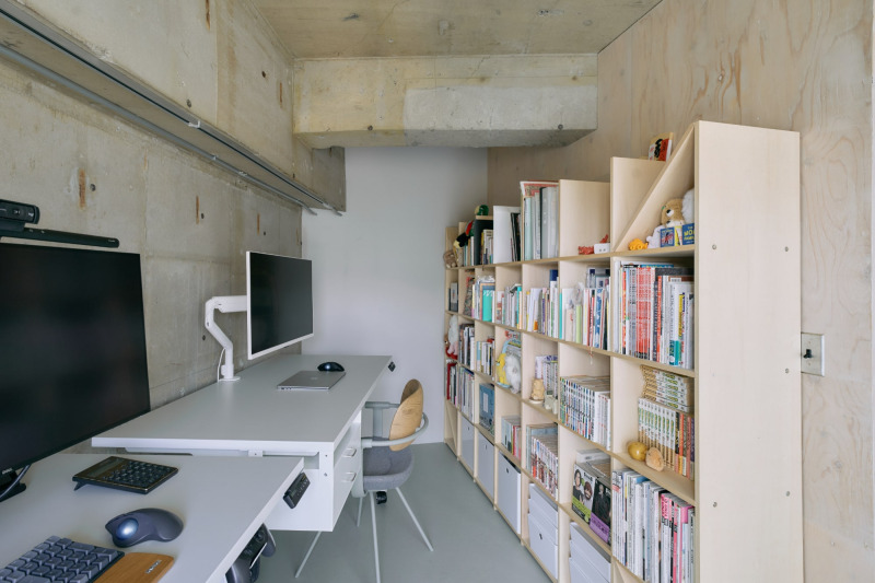 奥へ向かって狭くなった台形状のワークスペースは、適度なおこもり感。空間の用途が変わってもいいように、デスクや本棚は造作ではなく置き家具を選択しています。