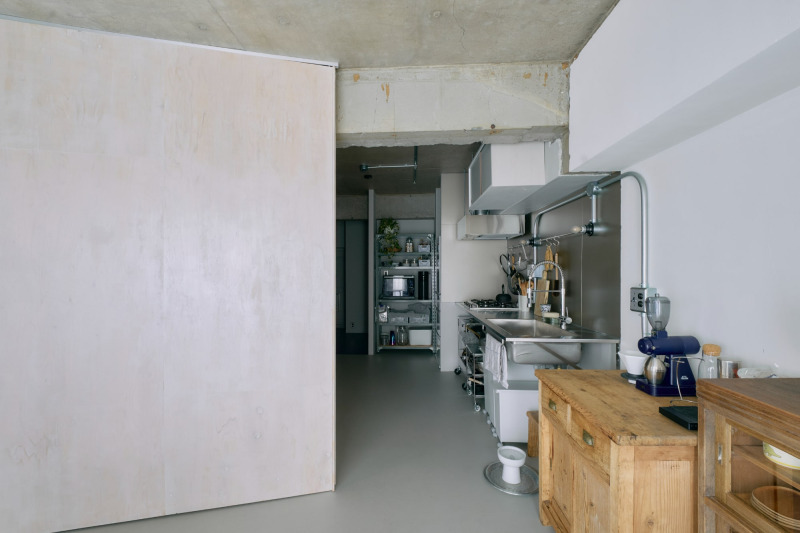 薄塗りのペイントが施されたラーチ合板の壁は、実は大きな引き戸。ほのかに光を反射するメタリックな塗料を塗って、ラフな印象のラーチ合板を上品に仕上げています。