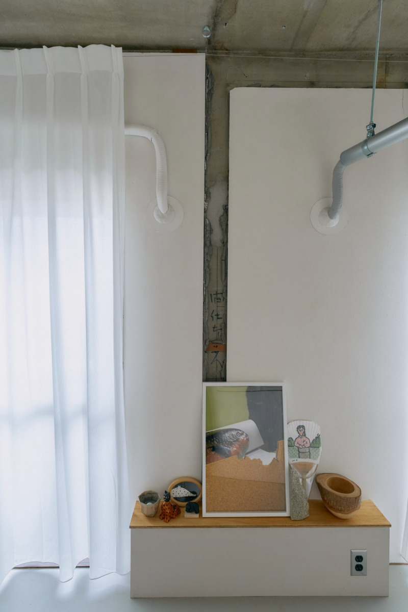 白壁の間に見えるコンクリート躯体は、間仕切り壁を撤去した跡。あえて仕上げずそのまま見せて、この空間の成り立ちを伝える要素にしているのがユニーク。