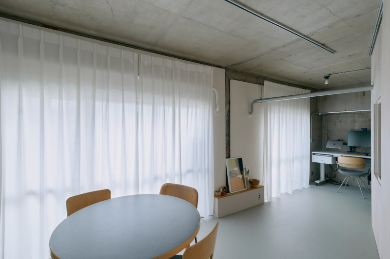 台形状の形が奥行きを生み、実寸以上の開放感を感じさせるリビングダイニング。カーテンは天井から吊るして、天井を高く感じるようにしています。
