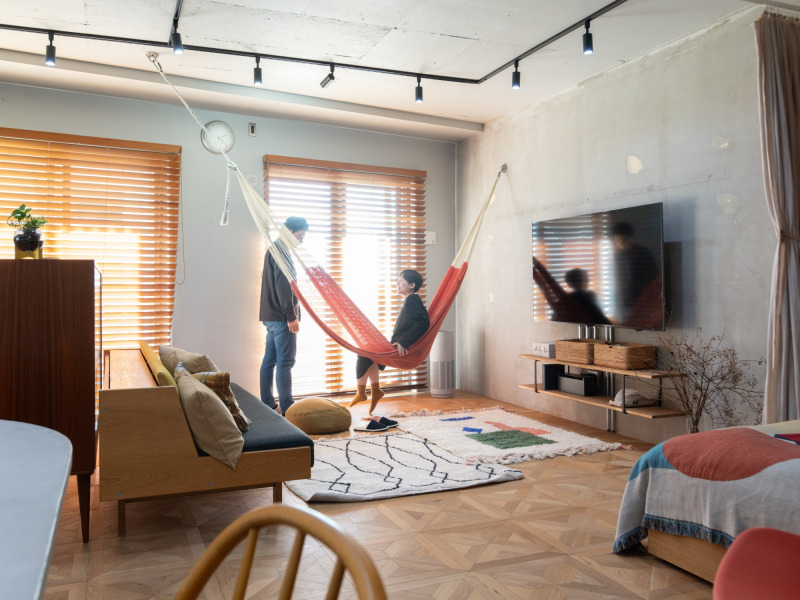 コンクリート躯体現しの壁と天井を利用して、リビングの窓辺にハンモックを設置。窓辺を“過ごす場所”に変えるアイデアです。
