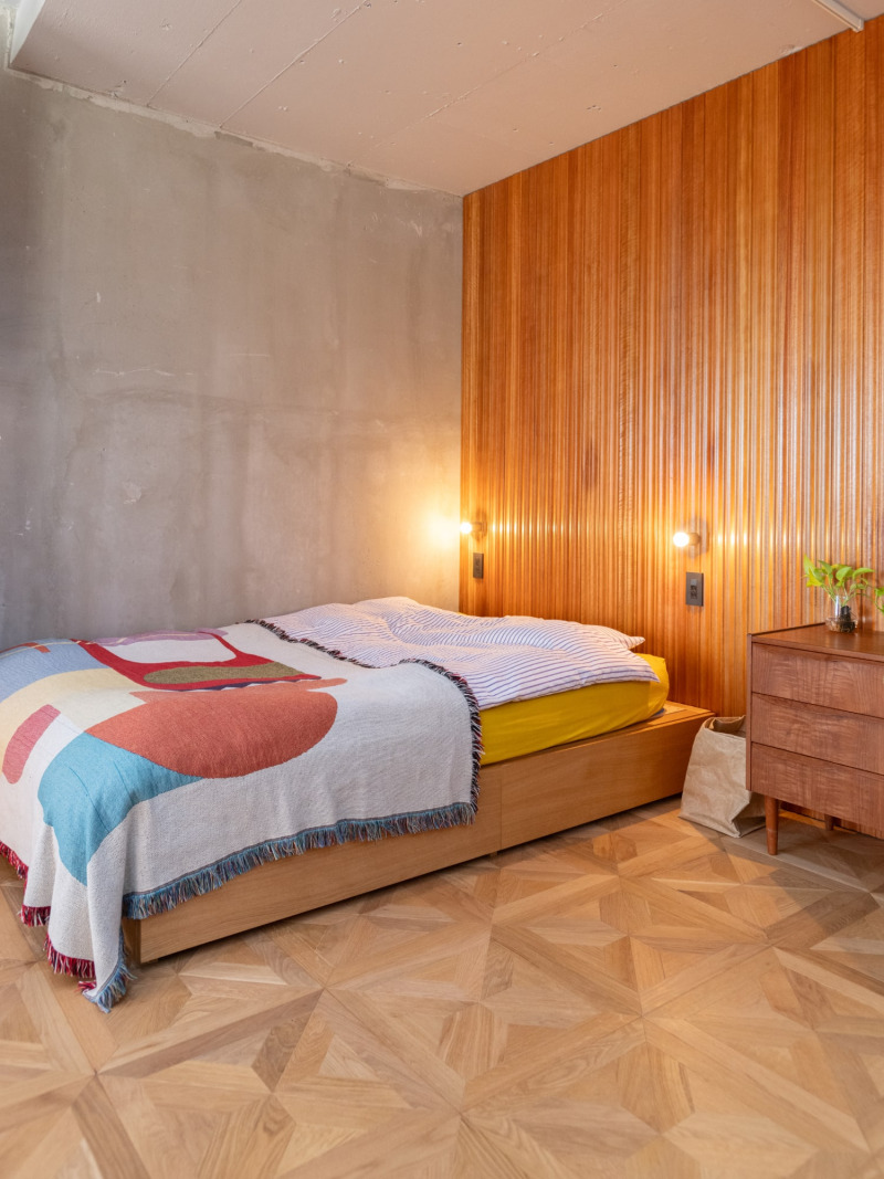 ブラケットライトの明かりと『クラシックリブパネル』が、親密な雰囲気をつくり出すベッドスペース。