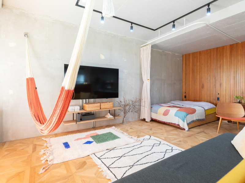 主寝室は個室化せず、リビングの一角をカーテンで仕切るスタイルに。カーテンを開けていればリビングの一部となって、広々としたリビングを満喫できます。