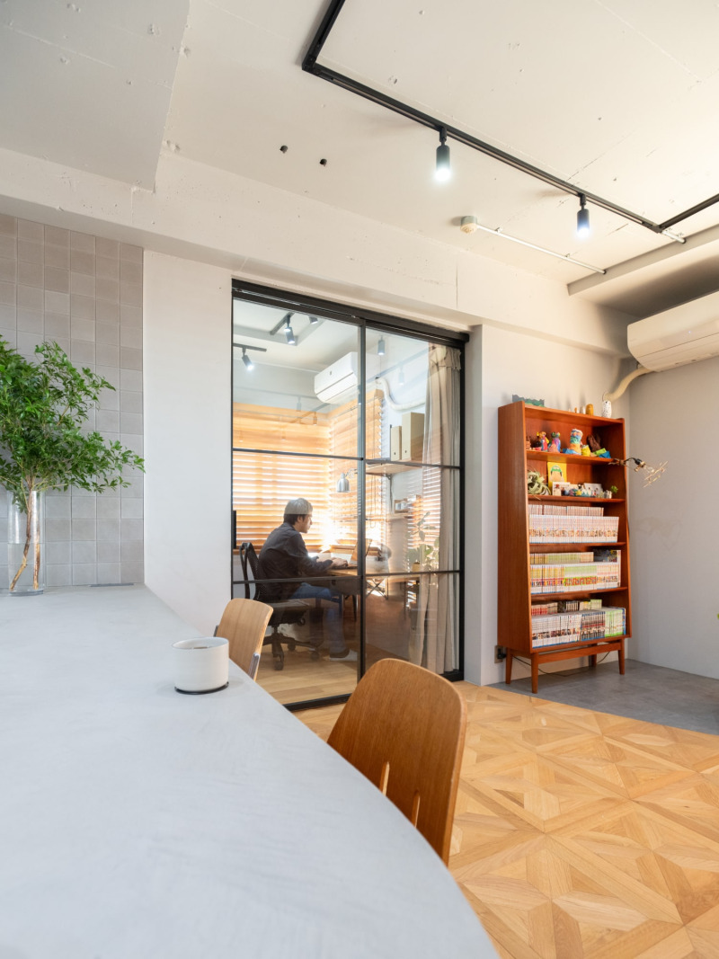 ガラス引き戸越しに見えるのは、子ども室の一角に設けたスタディスペース。集中できるように仕切りつつ、様子は伺えるよう、建具で工夫をしています。