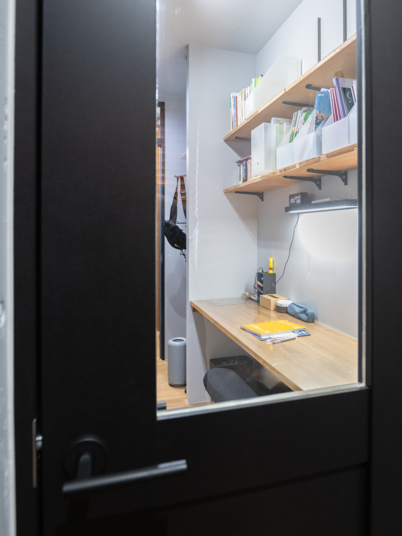 子ども部屋とは切り離してつくったスタディスペース。集中しやすいようコンパクトにしながら、ドアはガラス入りにして家族の気配を感じられる空間にしています。
