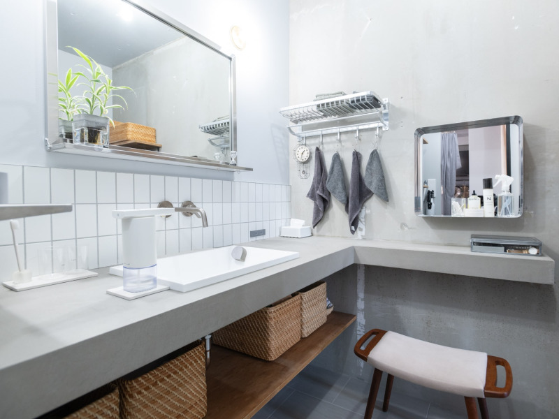 4人家族が暮らす家の洗面室。モールテックス仕上げの長いカウンターを造作して、複数人が同時に身支度できる空間にしています。