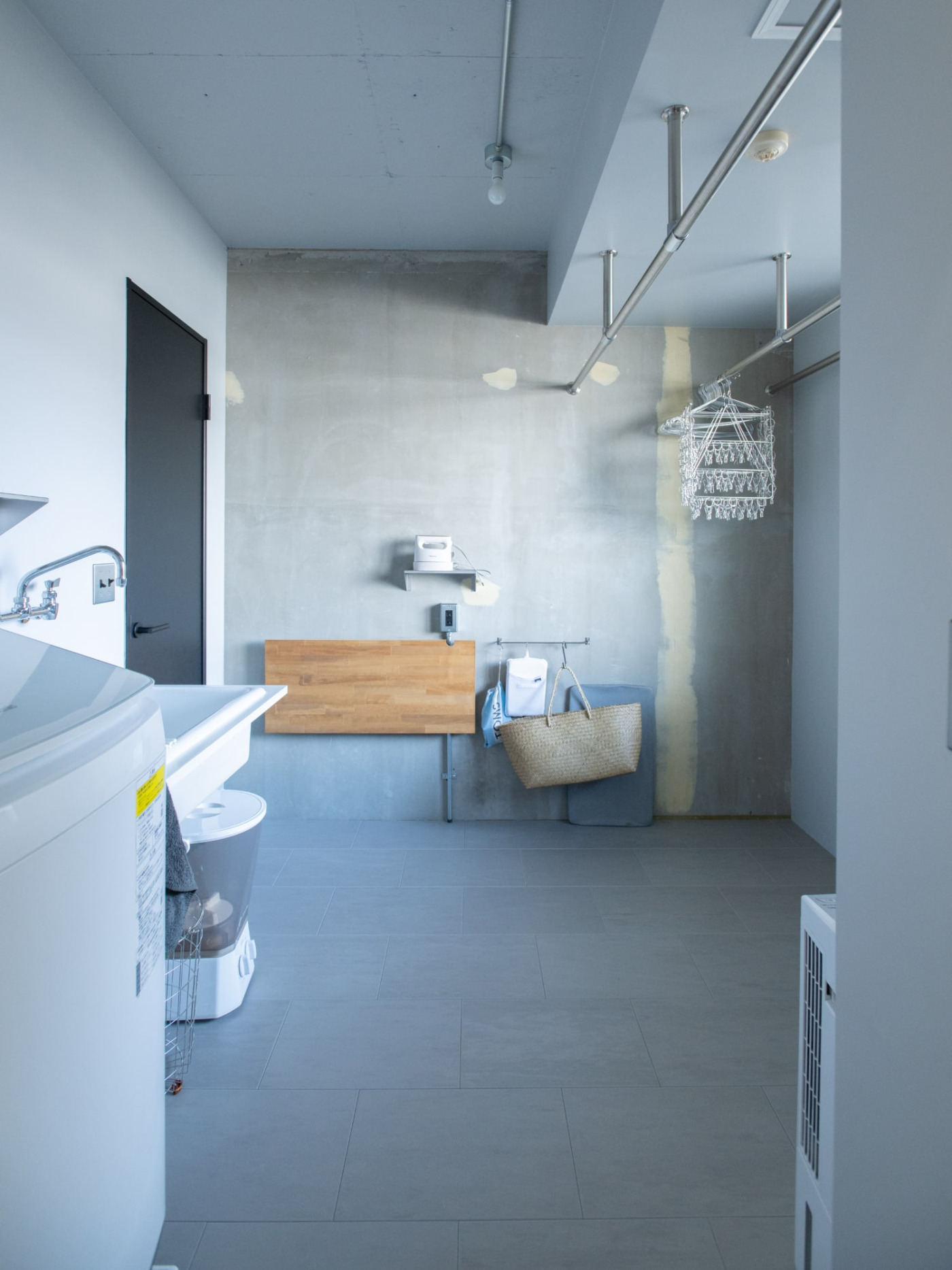洗濯も室内干しもアイロン掛けも一室でできるランドリールーム。正面に見える木天板は、アイロン掛けの時に使う跳ね上げ式のカウンター。