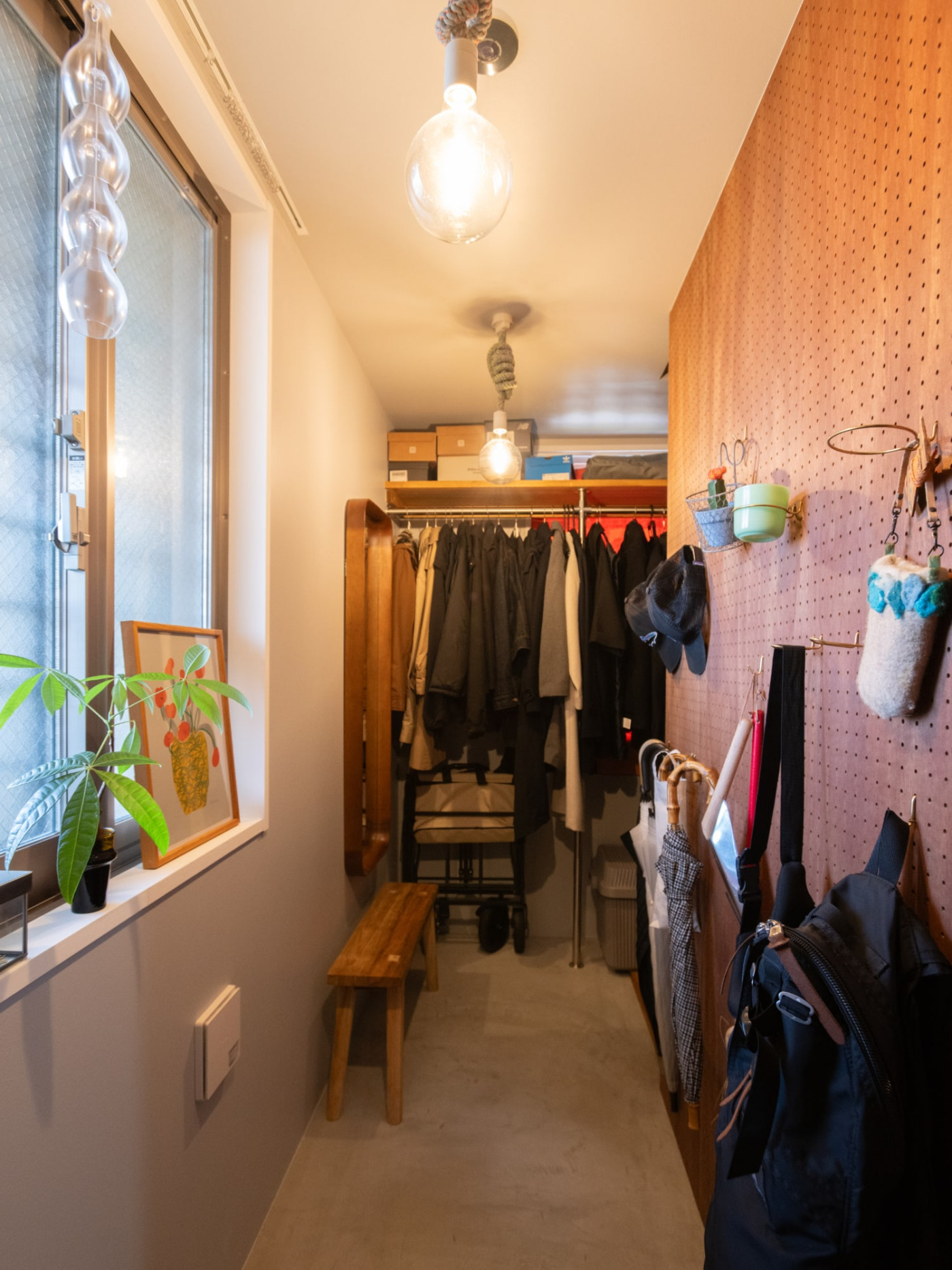 玄関土間の先に続くのはウォークインクローゼット。LDKへ続く廊下へとぐるりと回遊できるプランになっていて、朝のお出かけ時も帰宅時にも便利な収納動線。