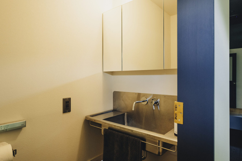最小限の機能に絞ったステンレスの『スクールシンク』とシンプルな『壁付けセパレート混合水栓』で、洗面空間をすっきりとまとめました。
