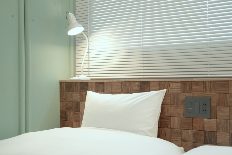 『古木タイル』をヘッドボードに使い、木目や色味の異なるピースが並ぶことで、温かみのある愛らしい雰囲気に。