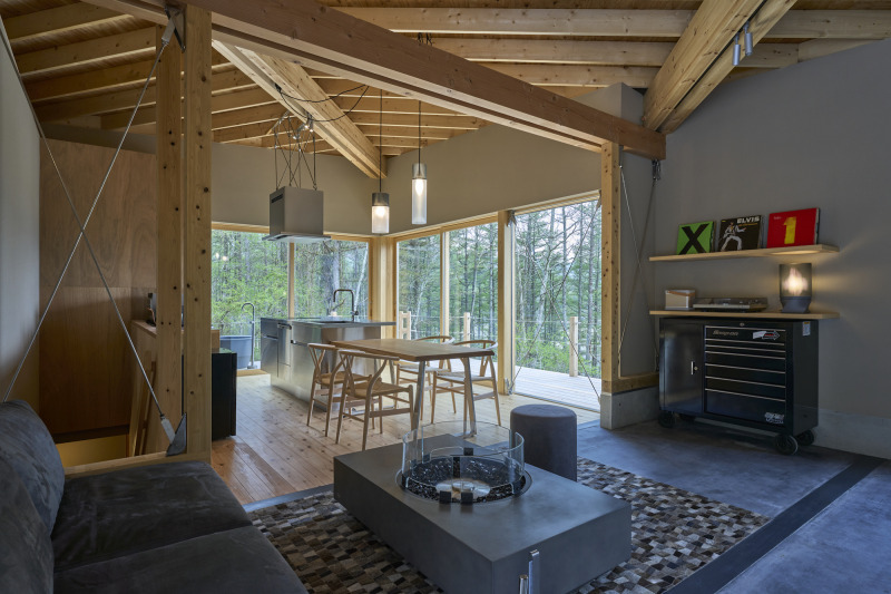 天井を斜めに走る「二重梁」が印象的な室内。訪れた人の視線を自然と窓の向こうへと導きます。