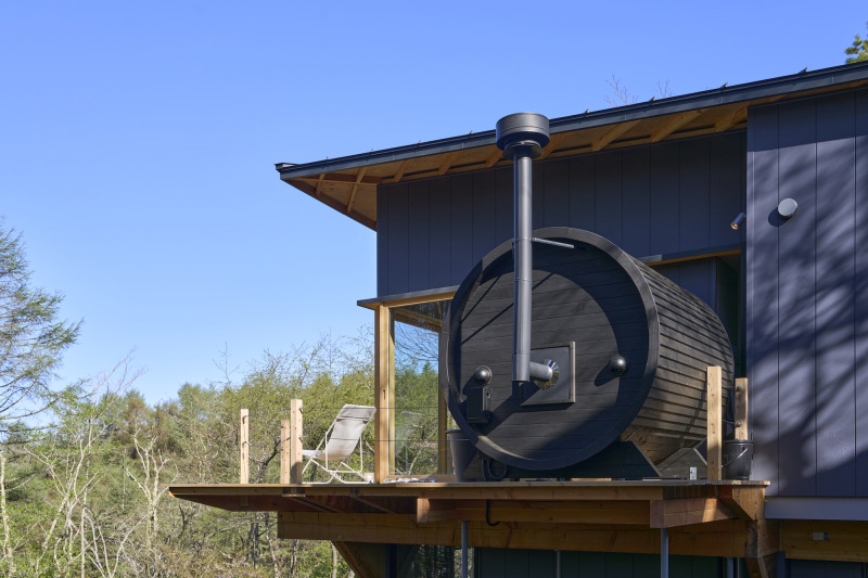 バレルサウナと富士山の天然水の水風呂が揃ったデッキで外気浴をしながら過ごす、大自然を満喫できる贅沢なひととき。