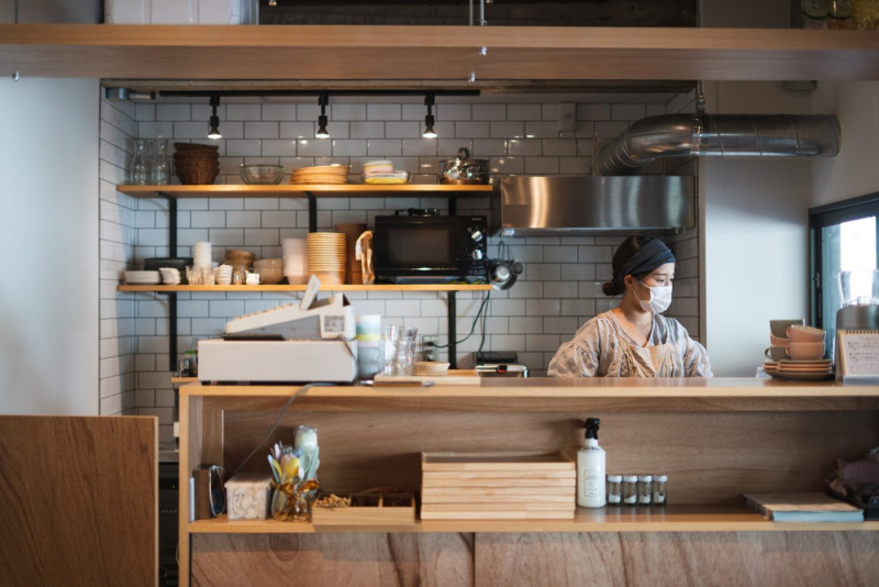 サブウェイタイルをアクセントに、ナチュラルなトーンにまとめられたカフェのキッチンスペース。