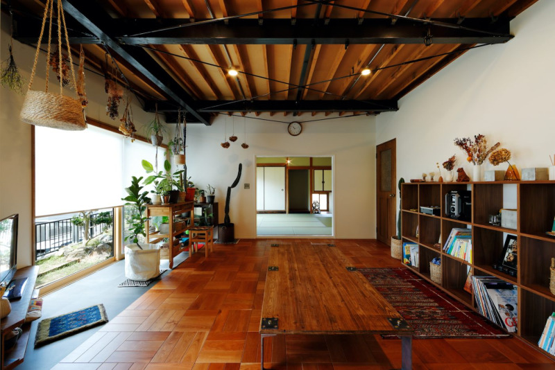 解体で現れた鉄骨をあえて剥き出しに。床はスクールパーケットで温かみをプラスし、窓際はグリーンを並べられるようタイルに切り替えて。開口から見える畳の空間が絵になります。