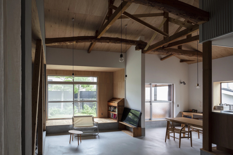 天井の一部を解体し梁や勾配を見せることで、ぐっとのびやかな空間に。経年変化を感じる梁の素材感が、空間に自然な深みを与えています。