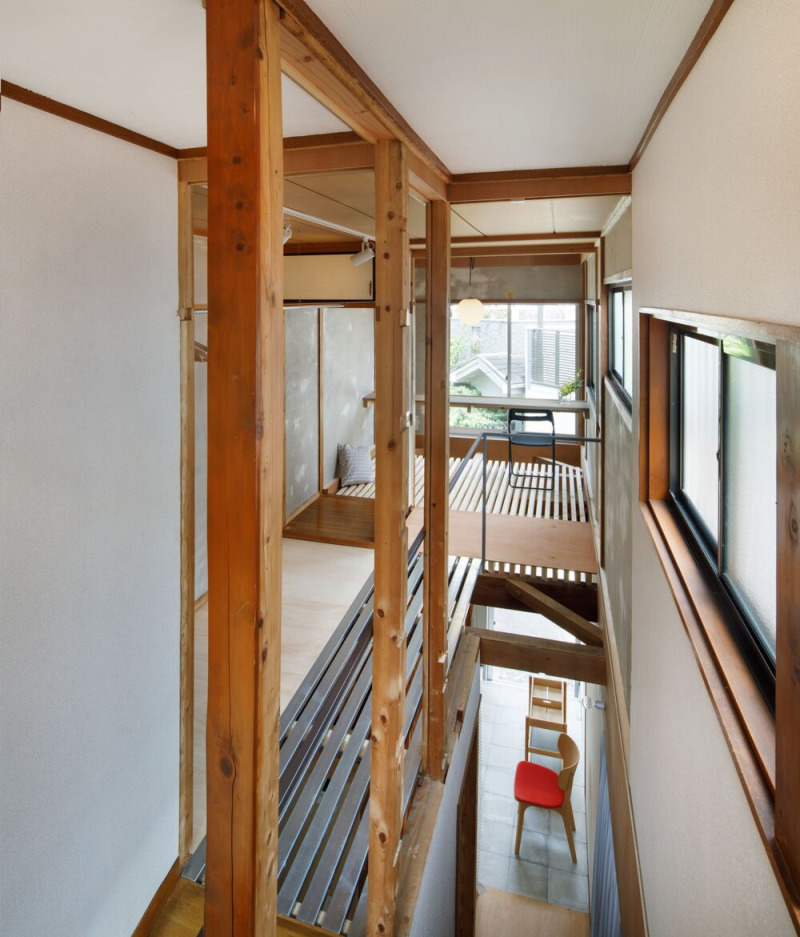 長屋ならではの「1階が暗くなりがち」という課題を解決するため、2階床にいくつもの孔を開け、光あふれる空間に。