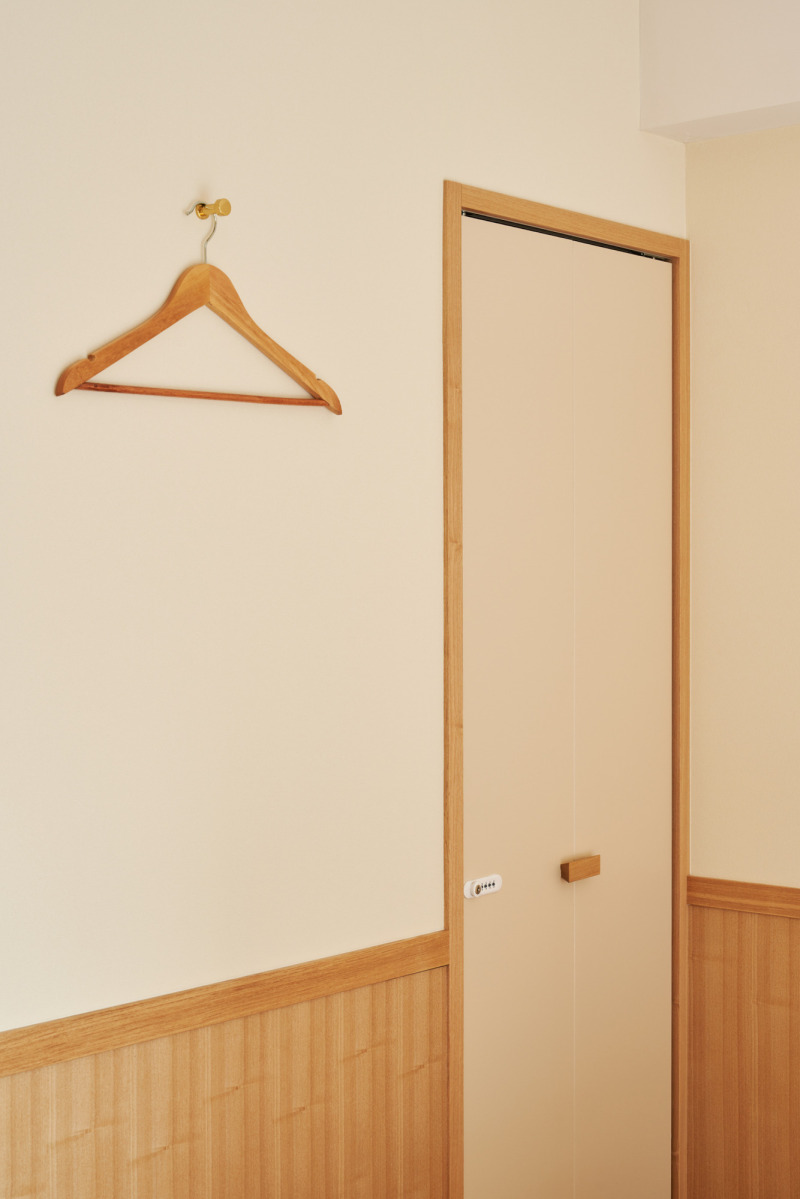 収納扉には、腰壁と揃えたオークの『木のつまみ』があしらわれています。