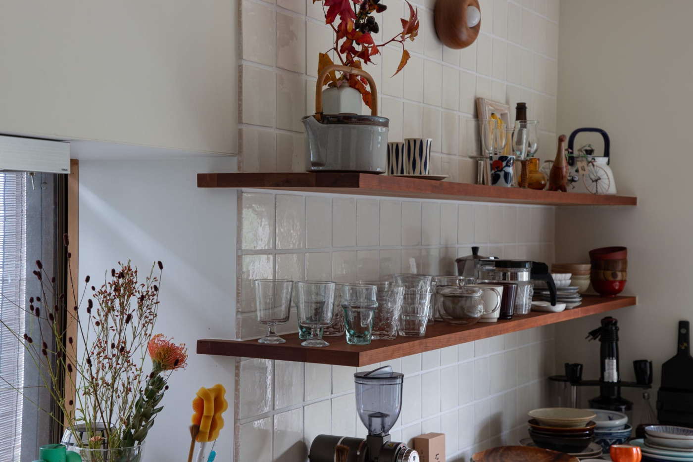 棚受けレスで、板だけが浮いているような棚。普段使いの食器はもちろん、見た目にテンションの上がるものたちを置く場所としているそう。