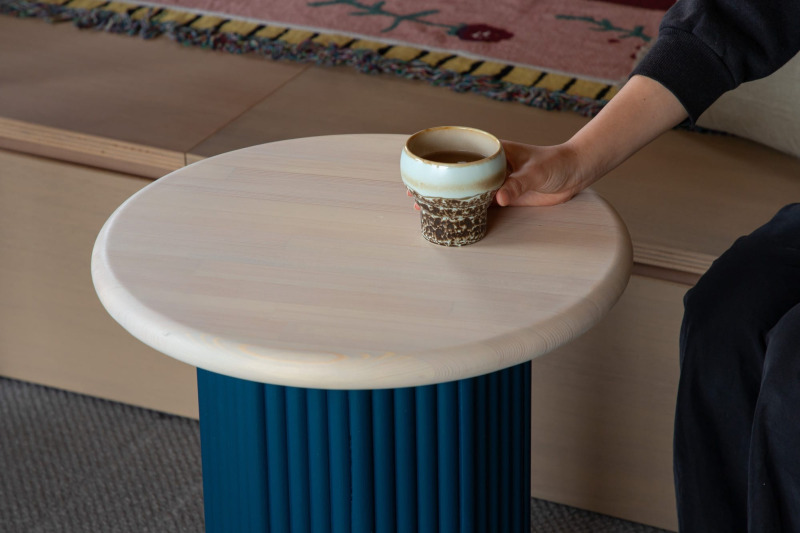 厚みのある丸天板を、つるんとした「ボウズ面」で。木の黄色味を抑えた白いオイル塗料で仕上げることで、カラーの映える仕上がりに。