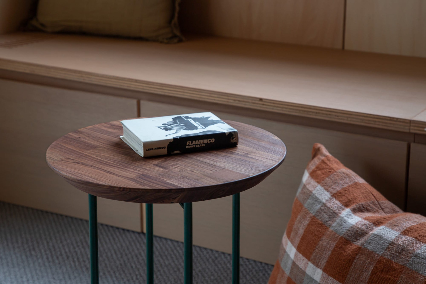 天板を載せただけ、手軽につくれるサイドテーブル。ウォルナットにははっきりとした色の脚がよく似合う。