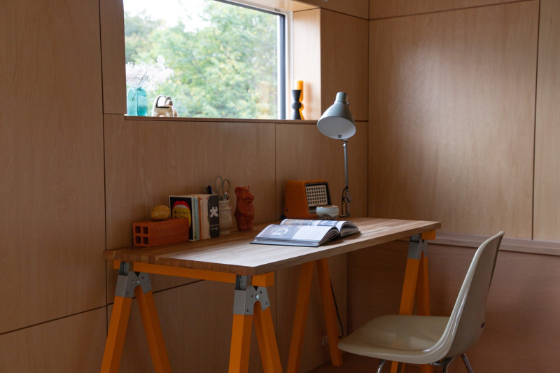 賑やかな木目模様の集成材に、サンイエローに塗装した脚を合わせたワークデスク。仕事の時間も華やかにしてくれそう。