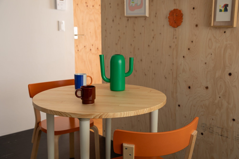豊かな木目のラーチ壁に、集成材のテーブル天板を合わせて。